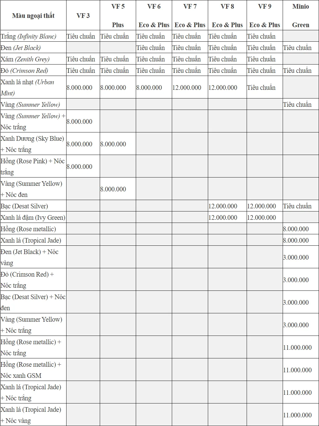 Chi tiết chính sách giá bán các dòng xe ô tô điện như sau: